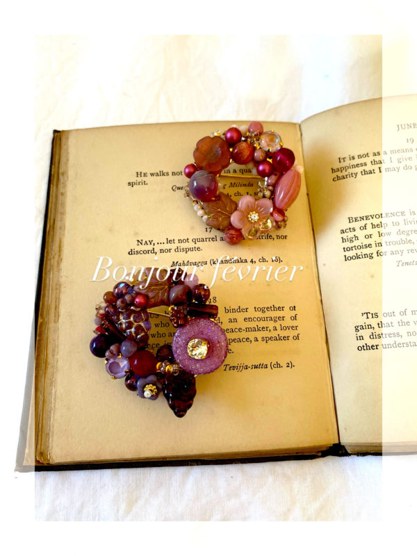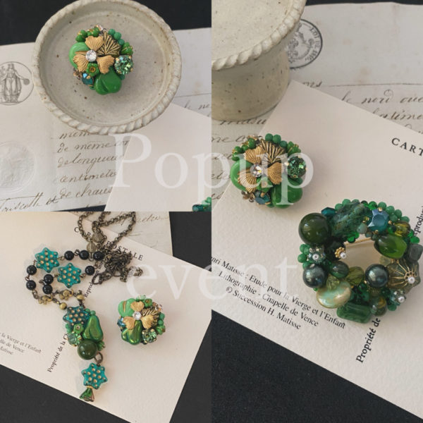 ノルマンディーの蚤の市で出会った職人だったムッシュより譲り受けたシャンデリアガラスは、ネックレスや耳飾りとなり、イベントの度、素敵なお客様のもとへ。